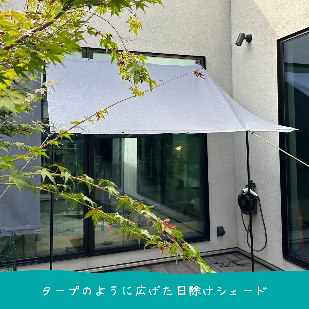 シェードの底辺にポールを設置することで、簡易タープとして使えます。犬のプール遊びや中庭での焼き肉に活用しています。
