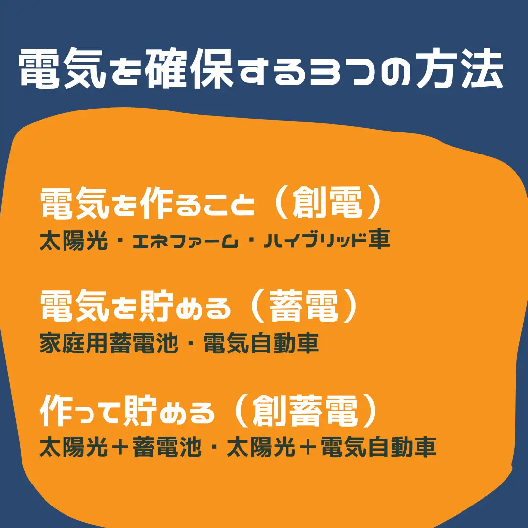 それでは必要な電力(最低3.3kWh)をどうやって確保するか?電気を確保するには大きく3つの方法があります。