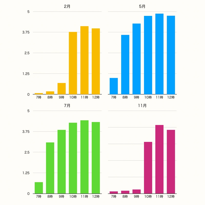 どの季節にも共通で、発電量が1kWh未満から3kWh超に跳ね上がるタイミングがあります。(例えば、5月の7時→8時や11月の9時→10時)