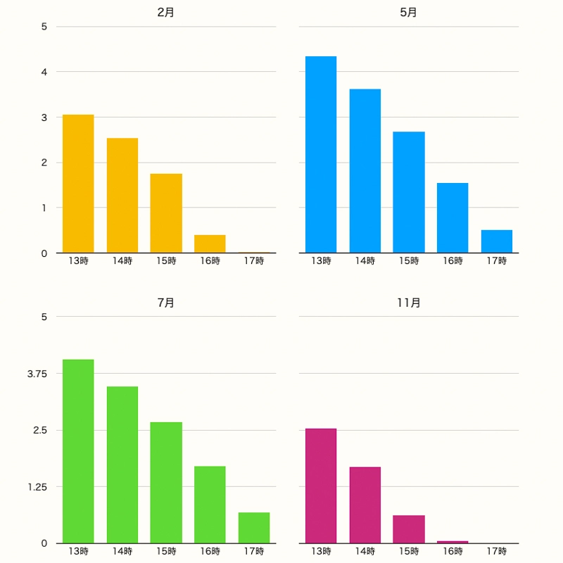 2月の場合、15時から16時で発電量が大きく減少。時間のズレはありますが、他の月でも同様の傾向が見られます。