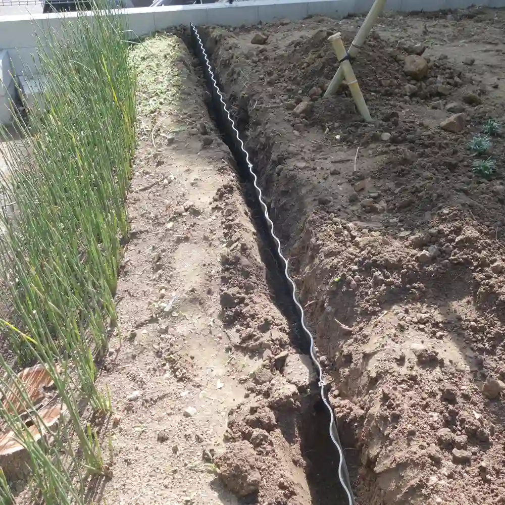 地下茎が広がり過ぎないように、法面と平面の境目にあぜ板(樹脂製で高さ40cm程度)を埋め込みました。