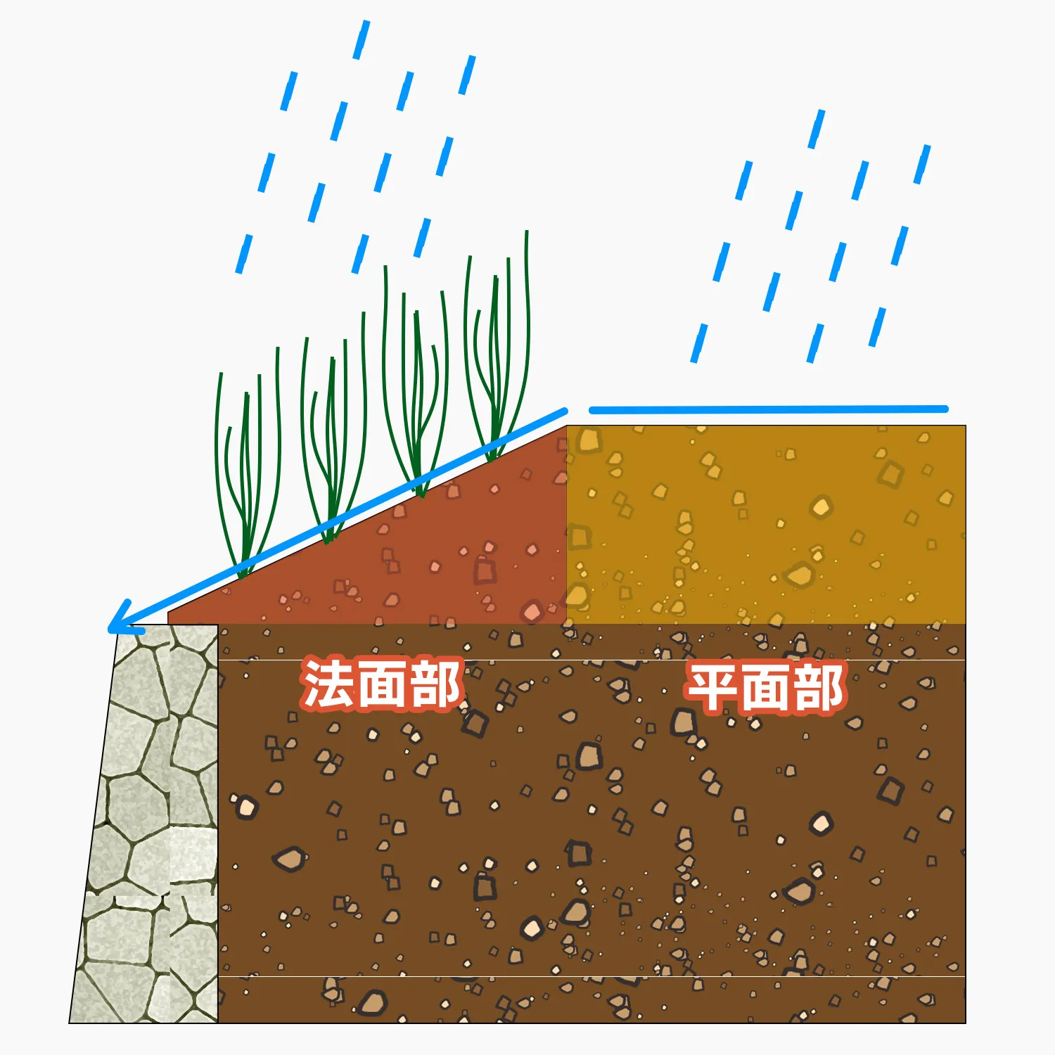 水が土に染み込むには一定の時間が必要ですが、斜面になっている法面の場合、水は染み込むより先に斜面を伝って下に流れてしまいます。