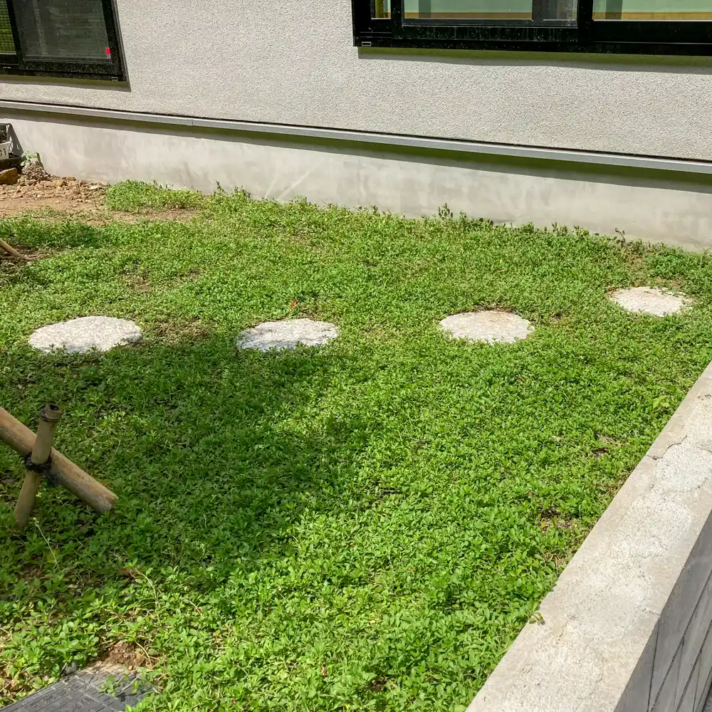 そこで、クラピアを撤去し表層の土をヤスデの死骸ごと入れ替え、ヤスデ対策としてクラピアよりランナーが弱い芝生を張ることにしました。