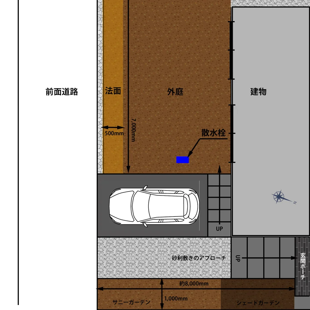 もう1台の車を止めるためには駐車スペースの確保が必要です。既存の駐車スペースは幅3mですが、隣接する玄関アプローチ(幅1.5m)と植栽スペース(幅1m)を使えば幅5.5mが確保できます。