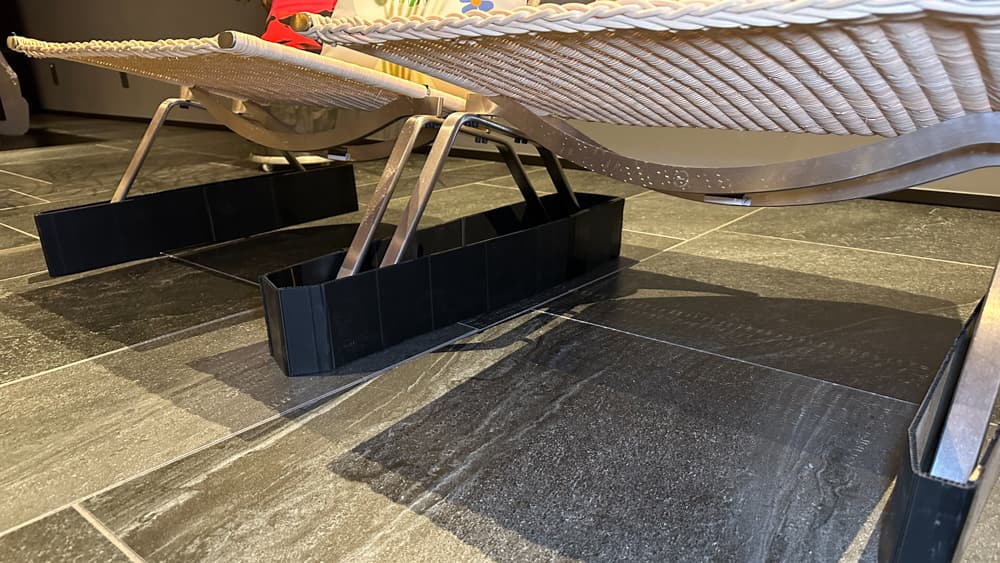 侵入防止にはレーザーで検知できるように仕切りを立てると良いそうです。プラ段を使って家具の足回りに仕切りを設置。来客時は取り外しますが再利用できて便利です。