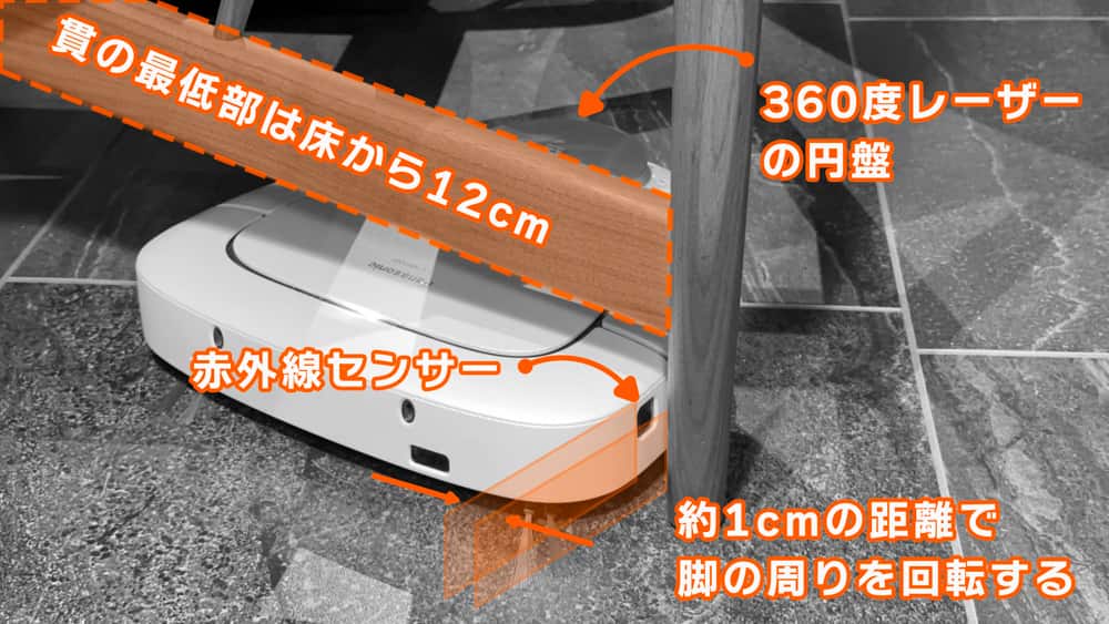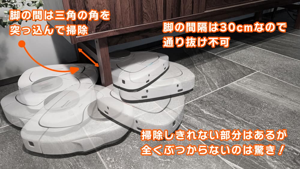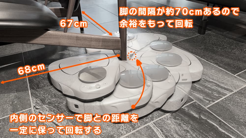 脚周りは左右のセンサーを使って円を描くように掃除。脚の間隔は70cmあるので、どの掃除機でもすり抜ける事は可能です。それでも、ぶつからずに脚のキワまで掃除となると話は別。R脚の周りを1cmの距離まで近づいて掃除できるのがRuloならではです。