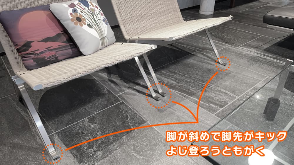 PK22というローチェアは脚の形状が特殊で、いつまでもよじ登ろうともがいています。「高さ10cmにあるセンサーがとらえる距離」と「キックしている脚の位置」が合わないことが原因と推測しています。Ruloの頭の中を想像すると次の通りです。