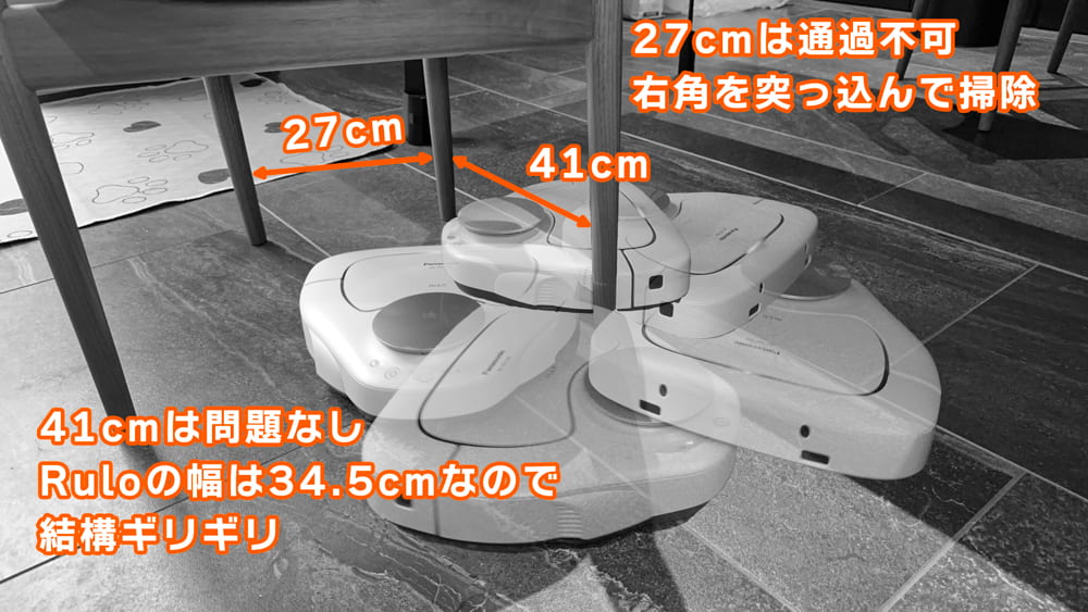 写真の椅子で脚の間隔は約41cm。Ruloの幅は34.5cmなので幅はギリギリです。右前脚から1cmの距離をとって回転。この後、左後脚の掃除を始めますが、さすがに27cm幅は通過できません。右角を脚の間に突っ込み、何度か前後して掃除してました。