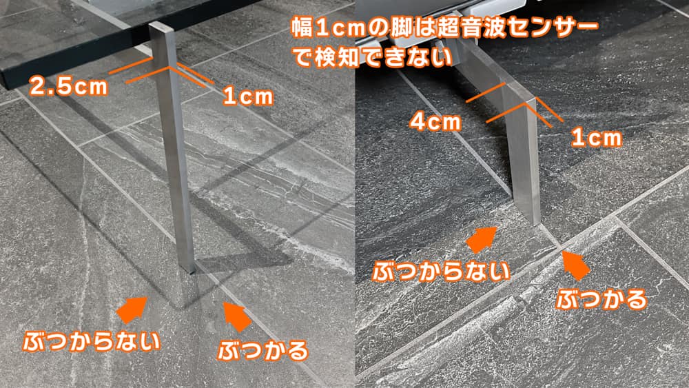 次に、検知できずにぶつかってしまう家具を紹介します。原因は「幅が狭くて検知できない」「低すぎて検知できない」の2通り。