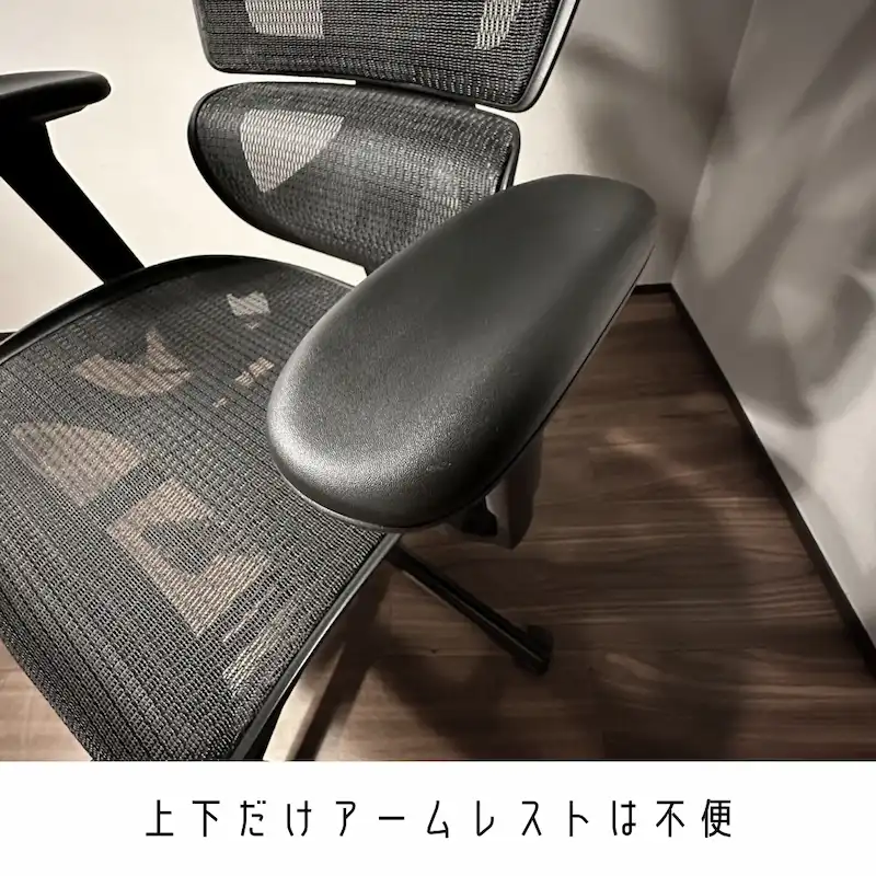 Proグレードのアームレストは高さを変えることしかできません。腕を置くだけならば問題ありませんが、デスクワーク中は前後位置と左右角度が変えられると便利です。