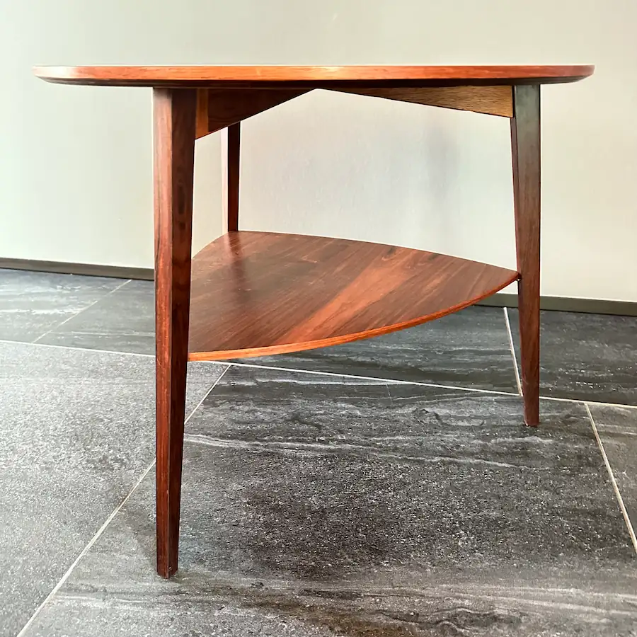 そんなサイドテーブルですが、新築から4年目の今年、ようやく気に入ったものが見つかりました。迫力のあるローズウッド天板と三角の棚板が特徴のビンテージ品です。